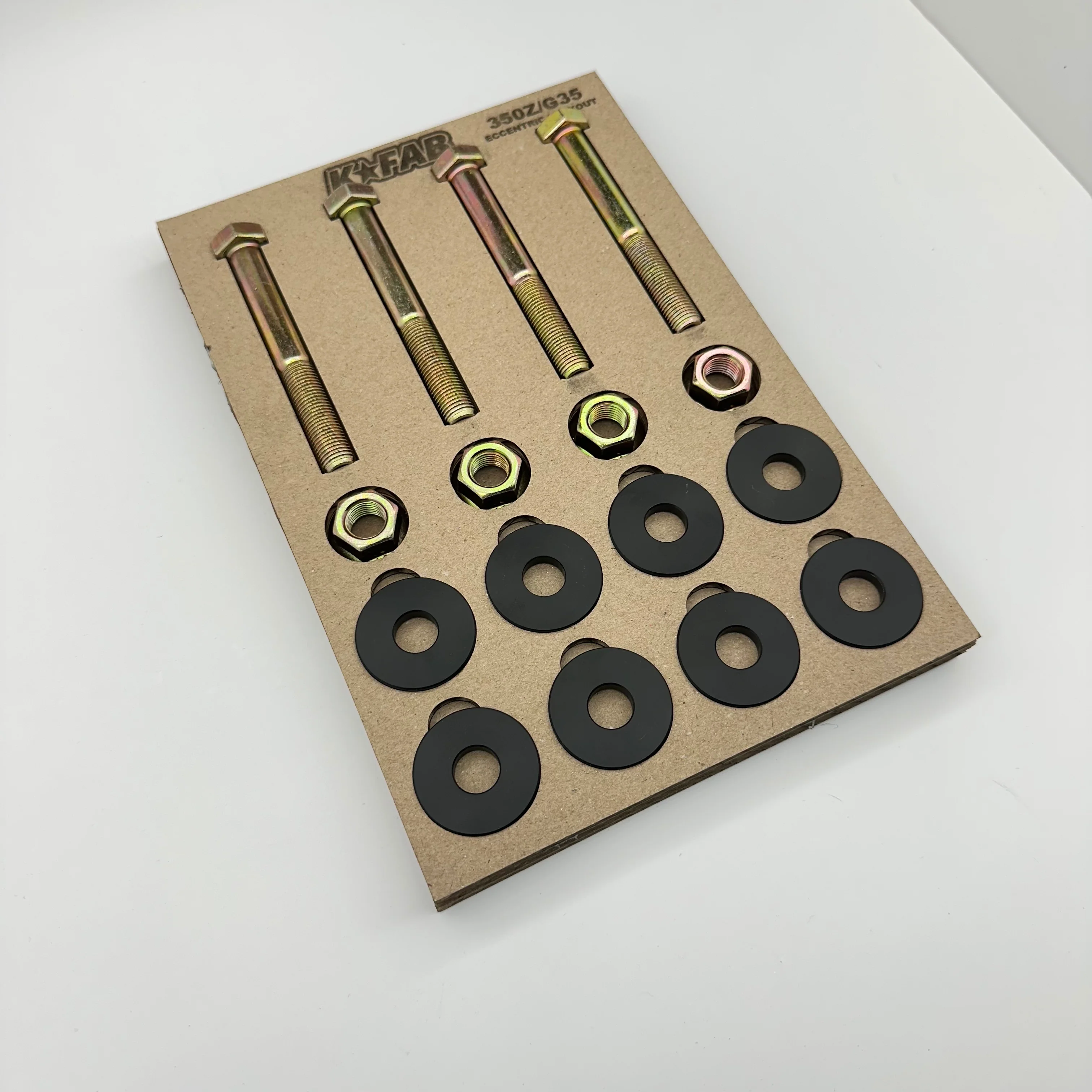The K-Fab Eccentric Lock-Out Bolt Kit is an essential upgrade for enthusiasts looking to optimize their car's suspension and alignment consistency. Upgrade your Nissan 350Z or Infiniti G35 today and experience superior handling and stability!